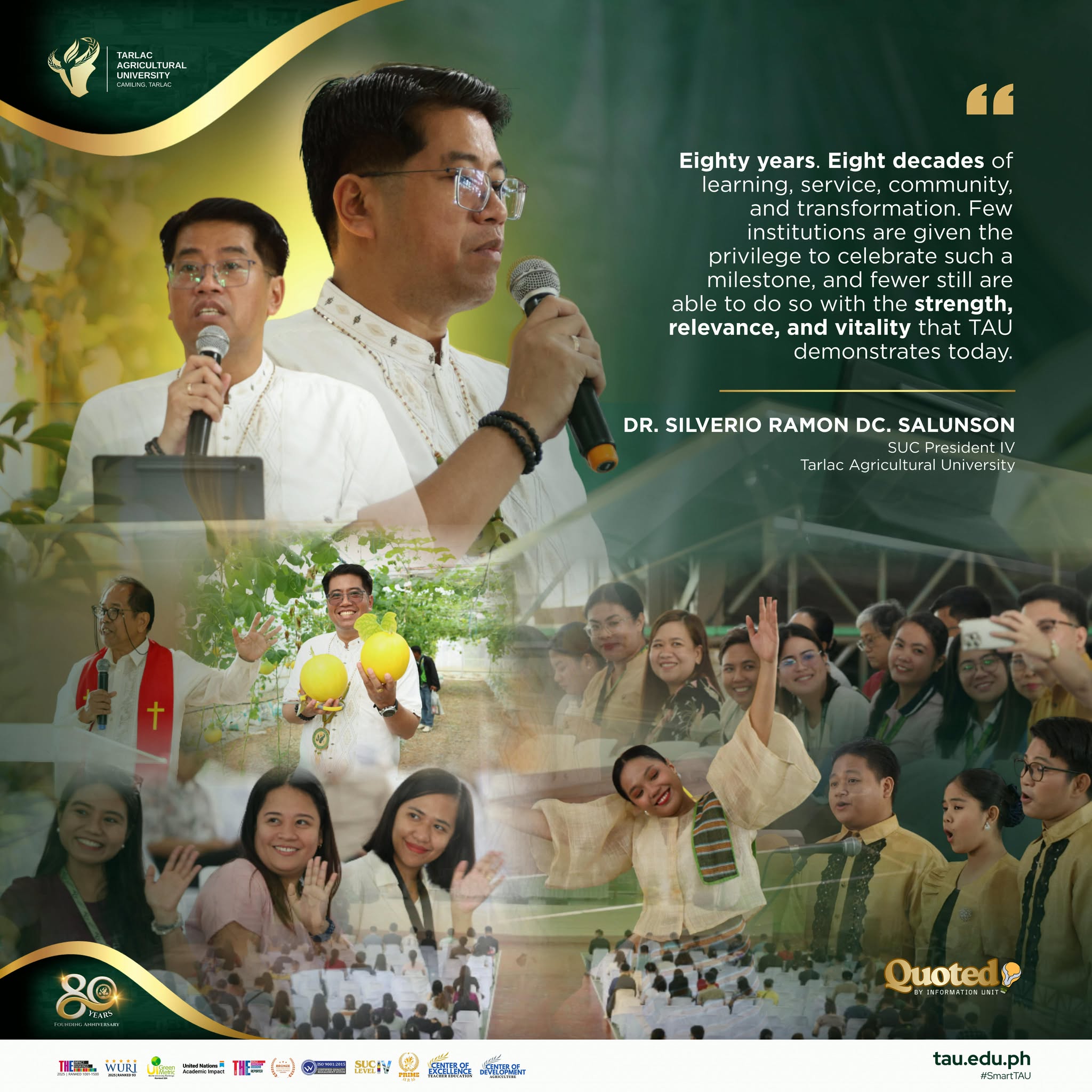 As the week-long celebration of Tarlac Agricultural Universityβs 80th Founding Anniversary draws to a close, University President Silverio Ramon DC. Salunsonβs message resonates as a fitting conclusion to a milestone marked by gratitude, reflection, and renewed purpose. In welcoming the TAU community to the Anniversary Convocation, he underscored the remarkable collective journey that transformed the institution from a modest high school into a globally engaged university. He paid tribute to the people behind this progress, affirming that TAUβs true strength lies in its shared vision, unity, and enduring commitment to service and excellence.