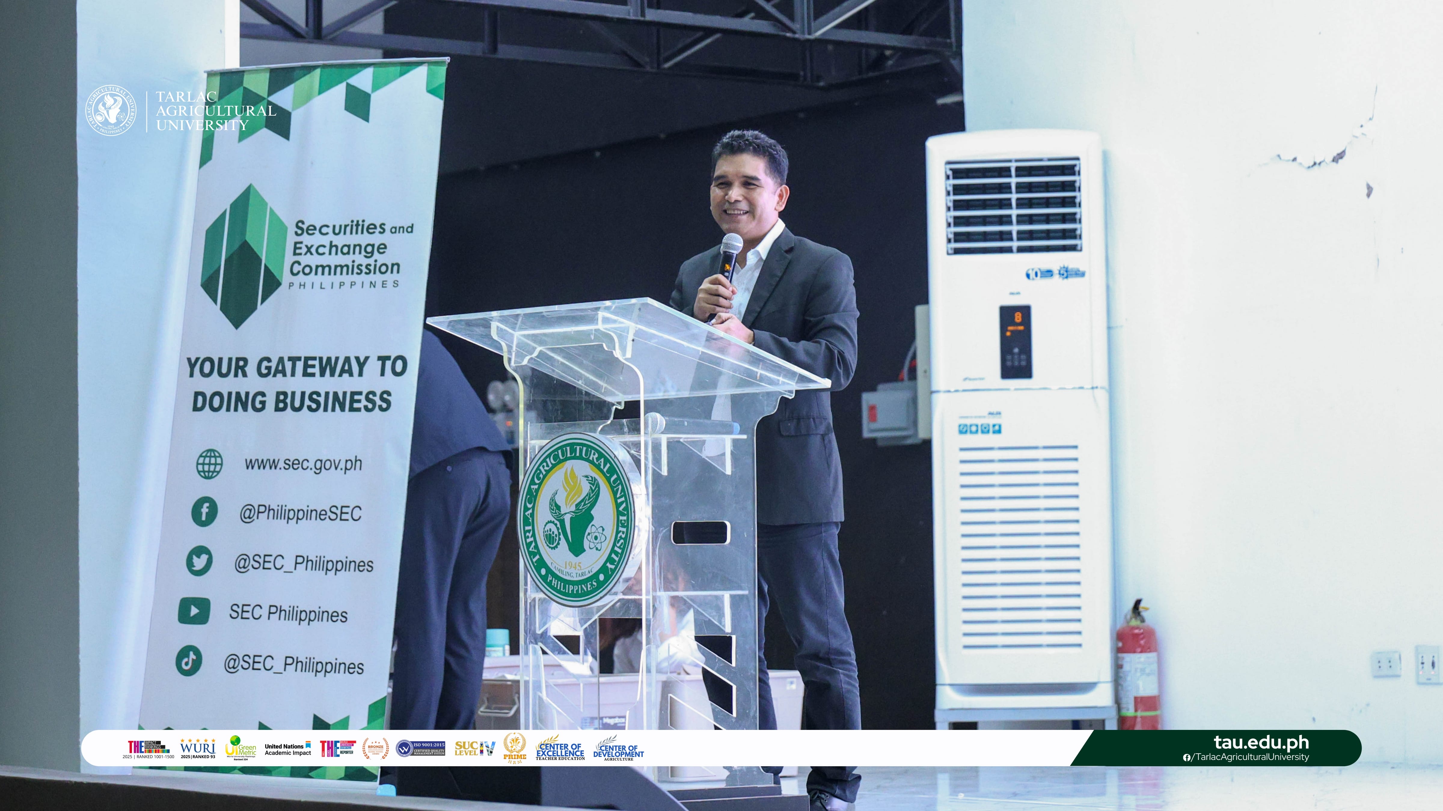 The Tarlac Agricultural University (TAU), in collaboration with the Securities and Exchange Commission (SEC) - Tarlac Extension Office, kicks off the Central Luzon Leg of the Investor Protection Week 2025 Campus Roadshow titled βInvested TAYO, Kinabukasang Sigurado,β at the TAU Student and Alumni Center Amphitheater on 18 November.
