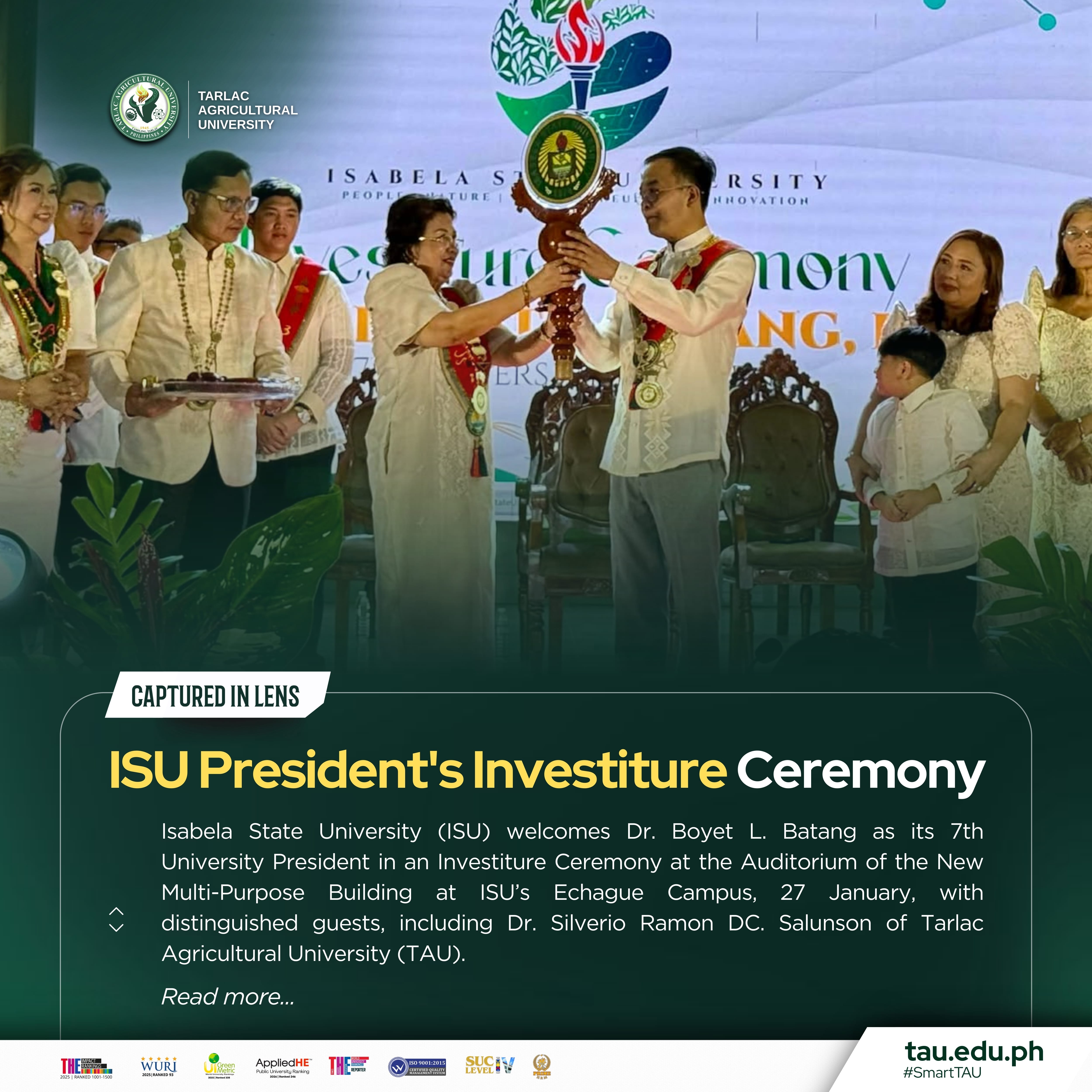 Isabela State University (ISU) welcomes Dr. Boyet L. Batang as its 7th University President in an Investiture Ceremony at the Auditorium of the New Multi-Purpose Building at ISUโs Echague Campus, 27 January, with distinguished guests, including Dr. Silverio Ramon DC. Salunson of Tarlac Agricultural University (TAU).
