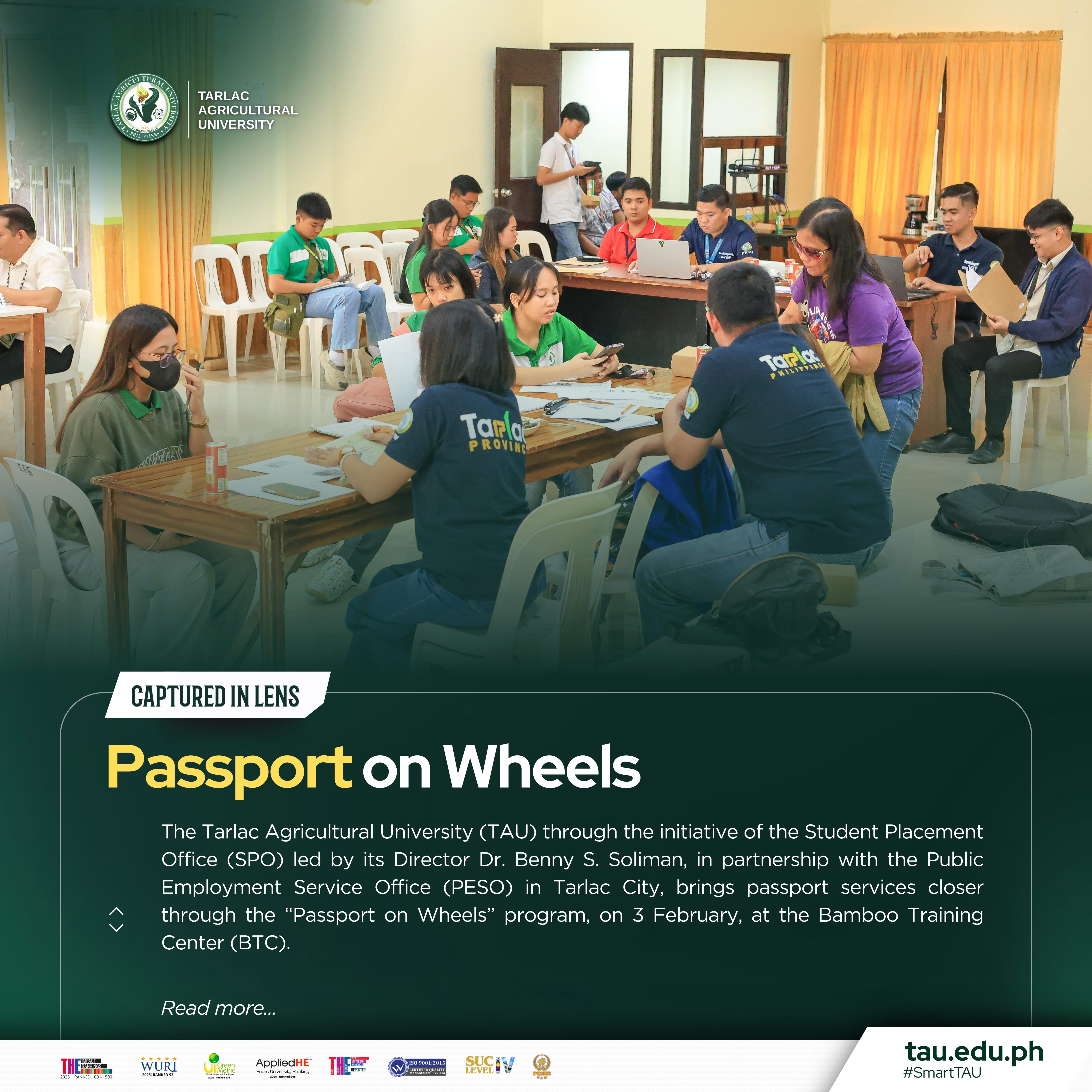 The Tarlac Agricultural University (TAU) through the initiative of the Student Placement Office (SPO) led by its Director Dr. Benny S. Soliman, in partnership with the Public Employment Service Office (PESO) in Tarlac City, brings passport services closer through the βPassport on Wheelsβ program, on 3 February, at the Bamboo Training Center (BTC).