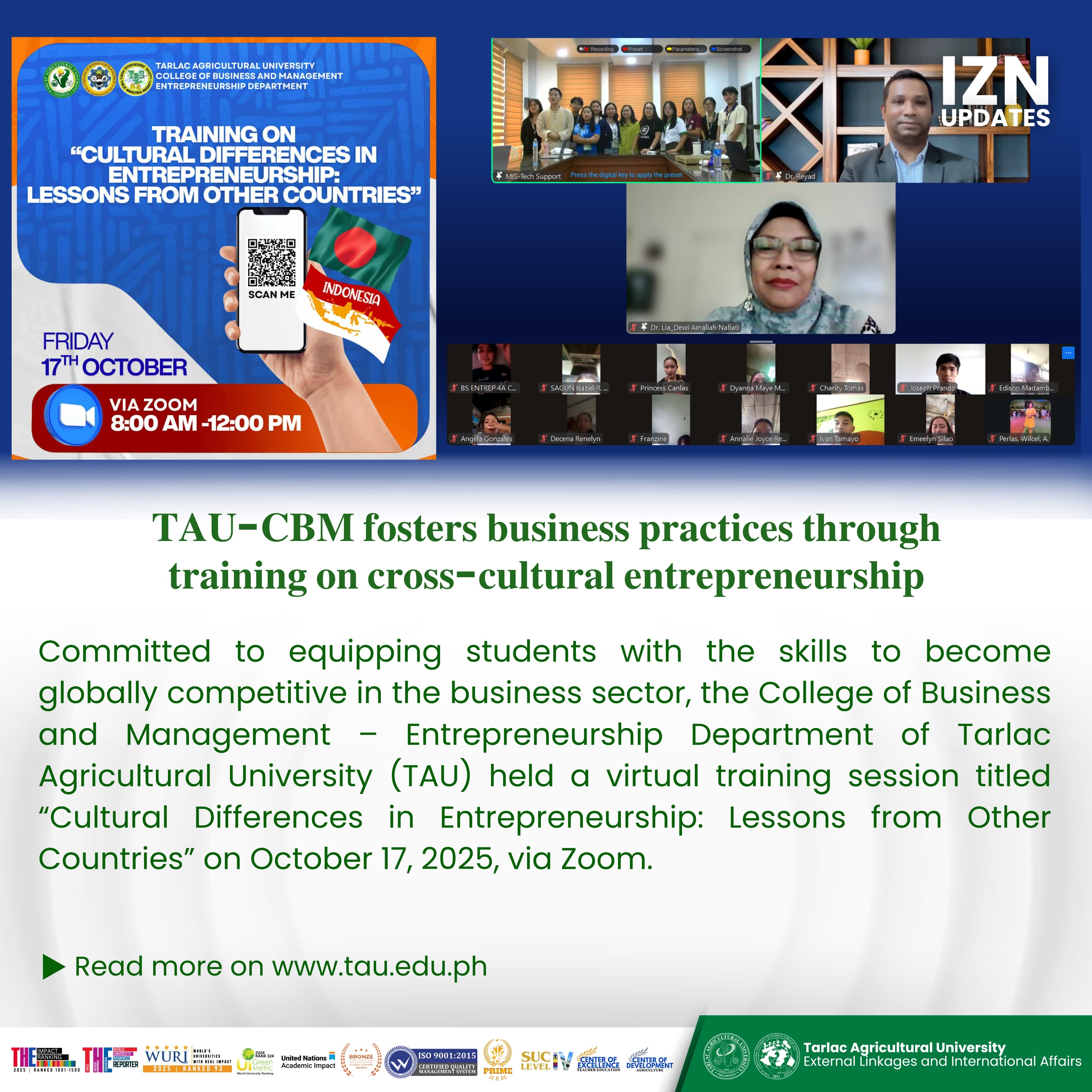 Committed to equipping students with the skills to become globally competitive in the business sector, the College of Business and Management โ Entrepreneurship Department of Tarlac Agricultural University (TAU) held a virtual training session titled โCultural Differences in Entrepreneurship: Lessons from Other Countriesโ on 17 October 2025, via Zoom.