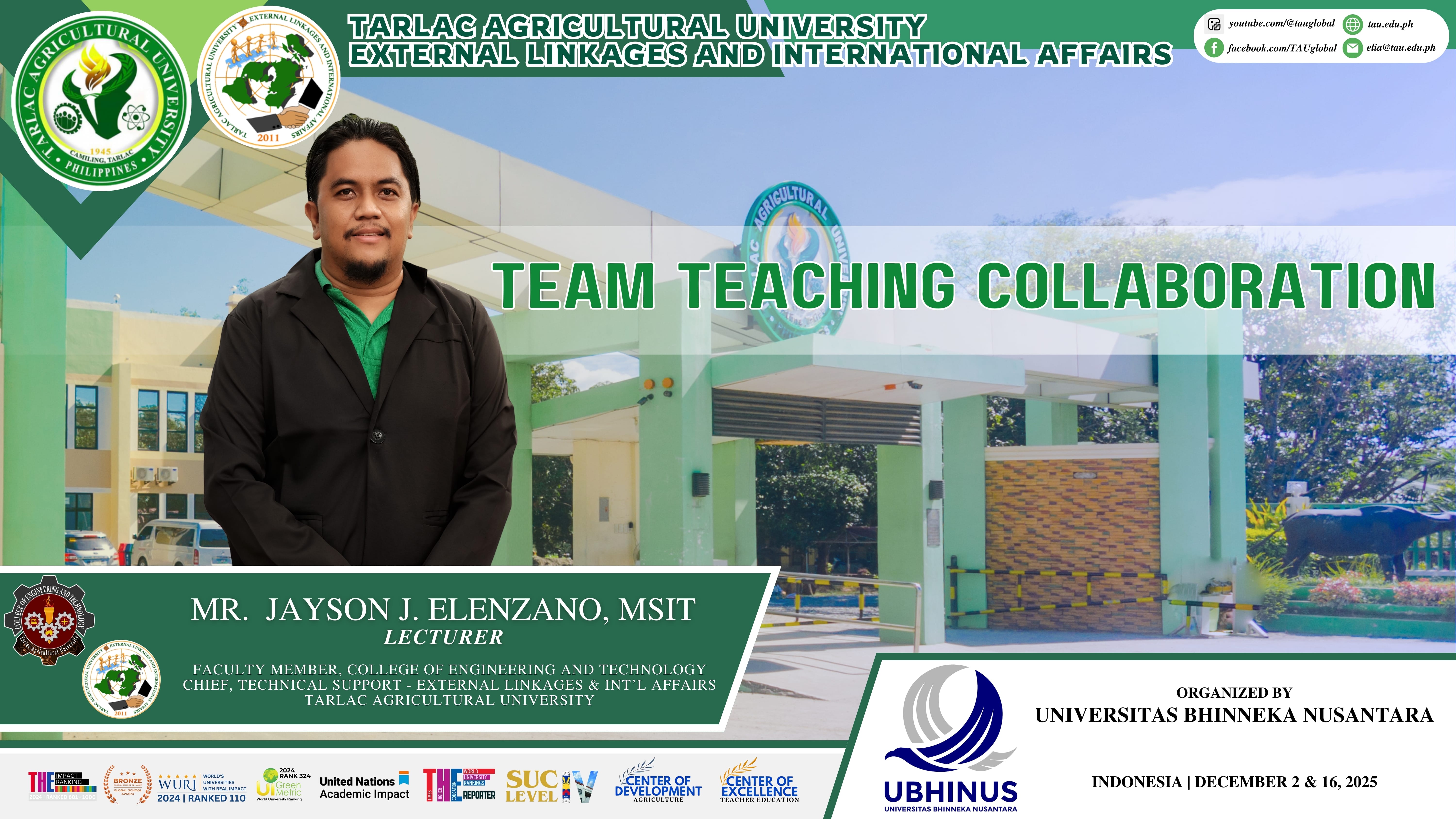 One (1) slot is open for a faculty member of the Tarlac Agricultural University (TAU) to participate in the CommTECH Camp Insight 2026 with the theme, โMore than a short program: Global Connections for our Future Community,โ a mobility program hosted by the Institut Teknologi Sepuluh Nopember (ITS) in Surabaya, Indonesia featuring SDGs Innovations to be held on 9-20 February 2026.