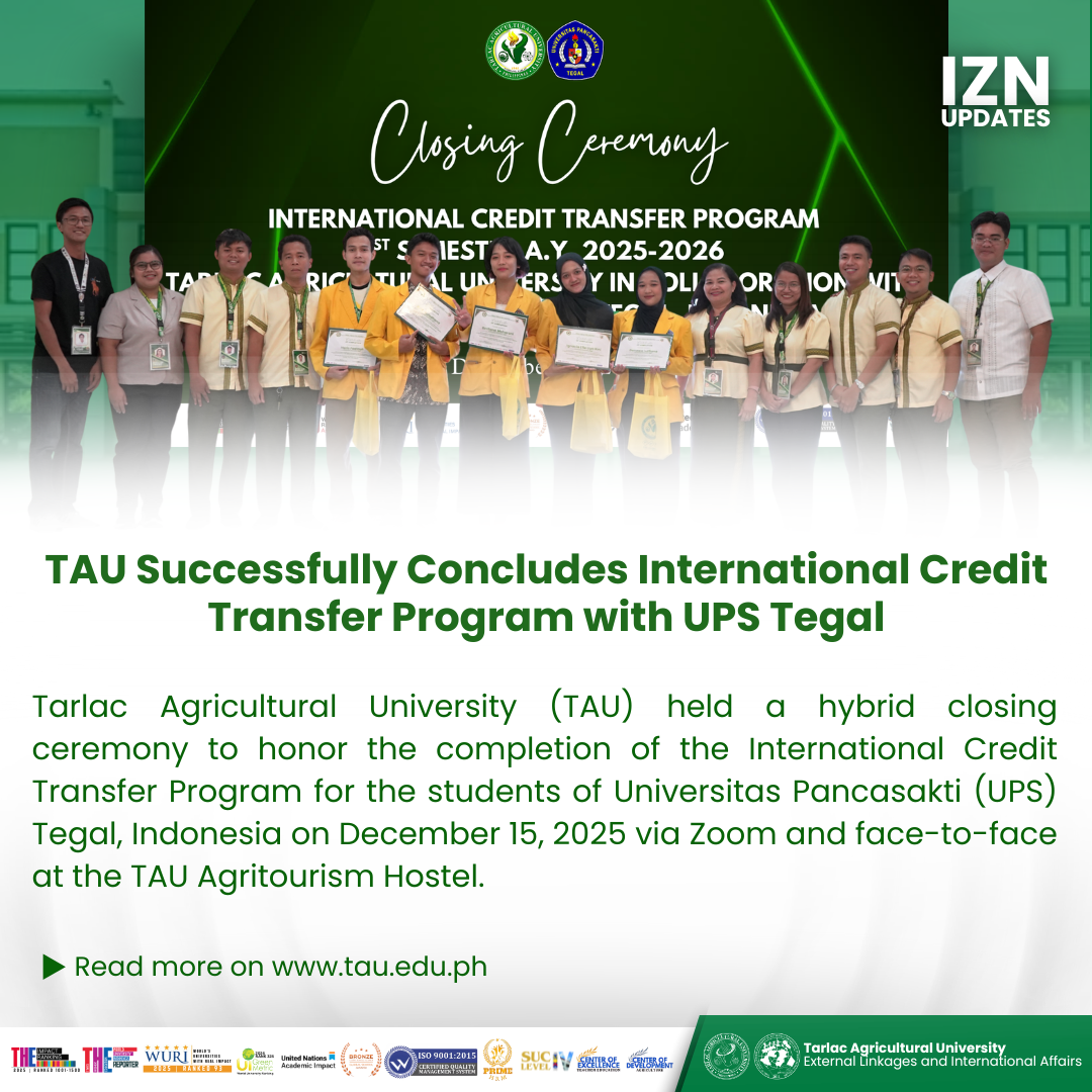 Tarlac Agricultural University (TAU) held a hybrid closing ceremony to honor the completion of the International Credit Transfer Program for the students of Universitas Pancasakti (UPS) Tegal, Indonesia on 15 December 2025 via Zoom and face-to-face at the TAU Agritourism Hostel.ย