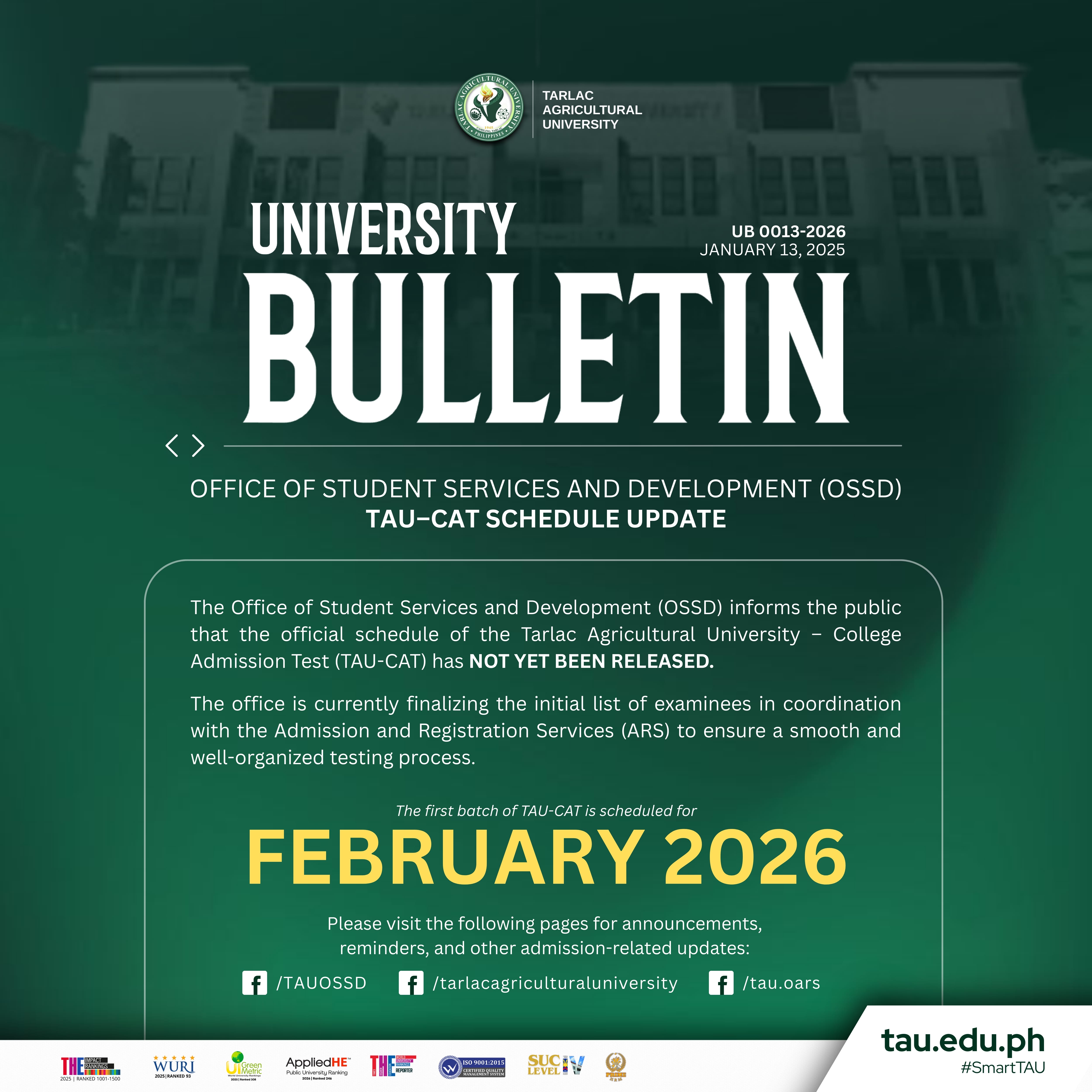 The Office of Student Services and Development (OSSD) would like to inform everyone that the schedule for the Tarlac Agricultural University โ College Admission Test (TAU-CAT) has NOT yet been released. The office is still finalizing the initial list of examinees in coordination with the Admission and Registration Services (ARS) Office to ensure a smooth and organized process.