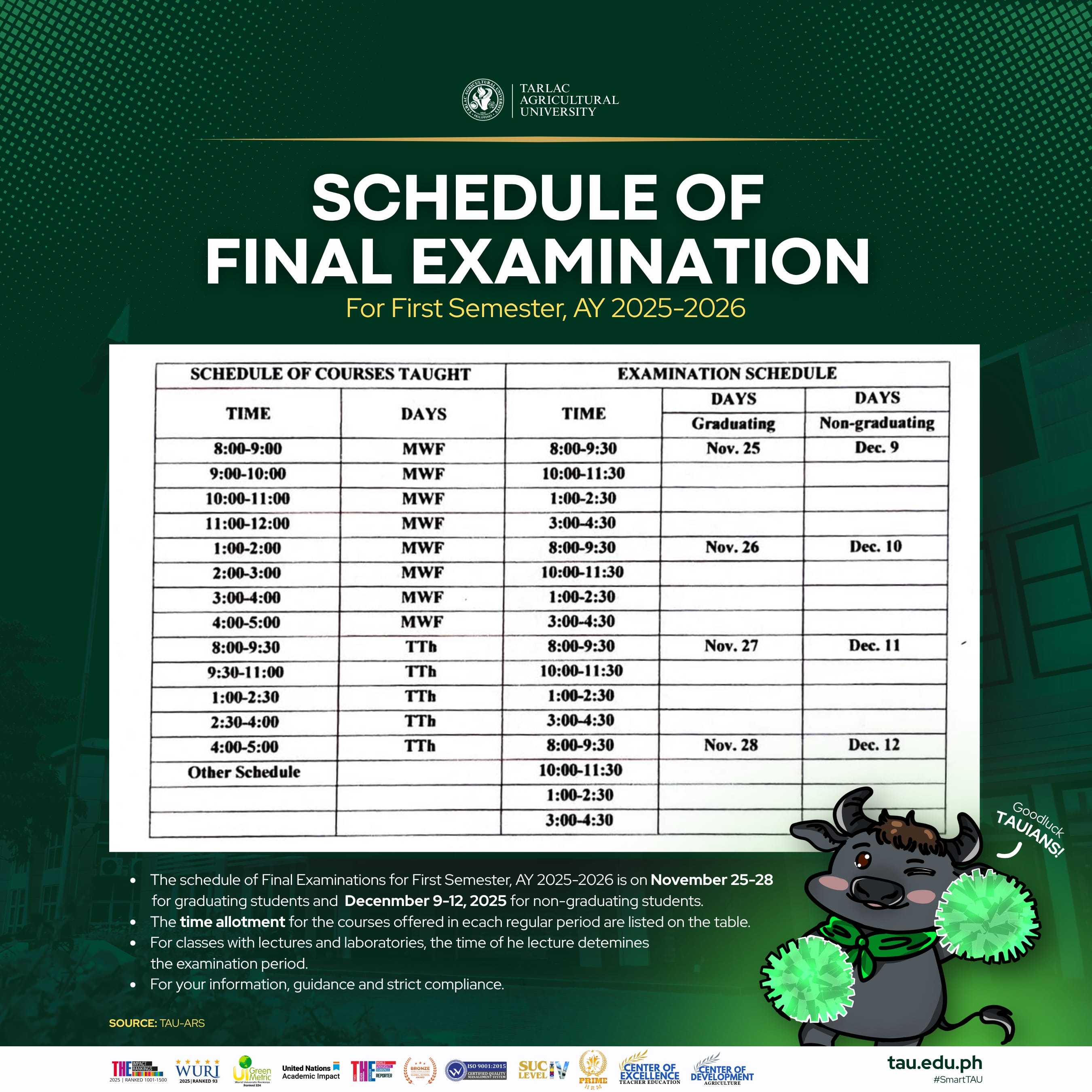 The schedule for the Final Examinations of the First Semester, Academic Year 2025-2026 has been officially released by the ARS. All graduating students are scheduled to take their examinations from 25 to 28 November 2025. All non-graduating students will have their examination period from 9 to12 December 2025. The specific time allotment for courses offered during each regular class period is detailed in the accompanying table for your reference.