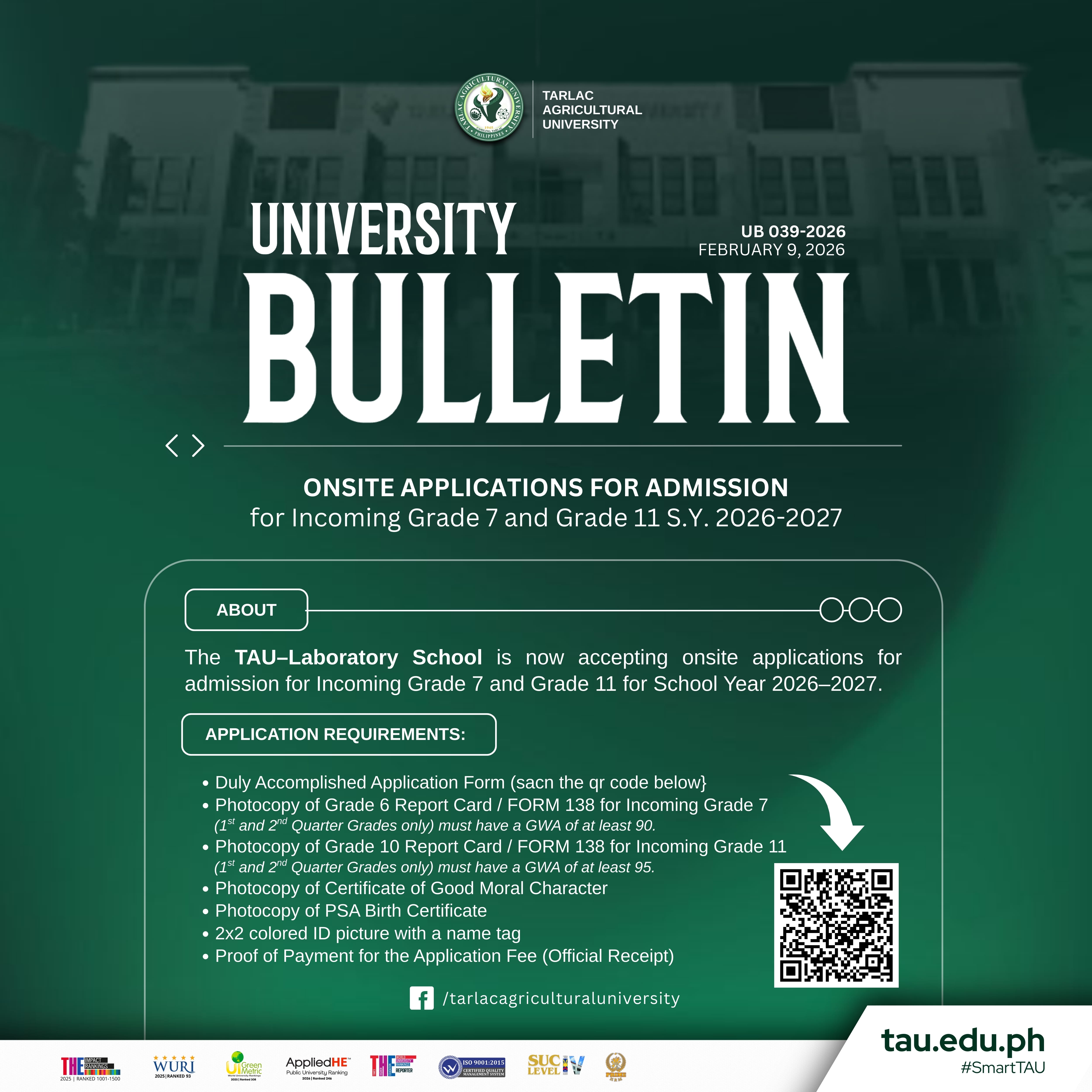 The Tarlac Agricultural University β Laboratory School (TAU-LS) is now accepting onsite applications for admission to incoming Grade 7 and Grade 11 for the School Year 2026-2027. Applicants must submit a duly accomplished form along with required documents, including a photocopy of report card (with a GWA of at least 90 for Grade 7 and 95 for Grade 11), a Certificate of Good Moral Character, a PSA Birth Certificate, a 2x2 colored ID picture with name tag, and proof of payment for the application fee. The application form can be downloaded here: https://bit.ly/4kpzaiI.