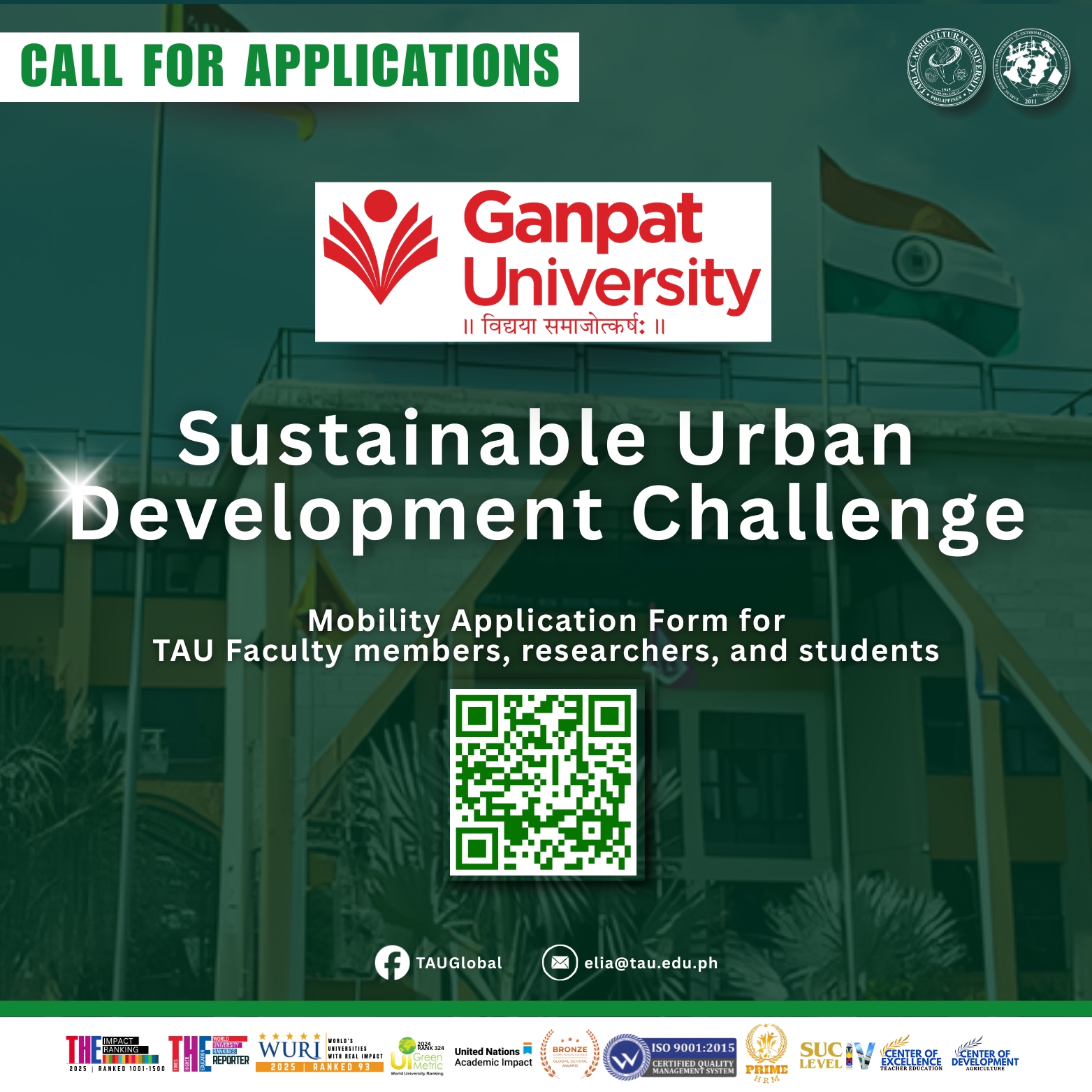Faculty members, researchers, and students of Tarlac Agricultural University (TAU) are encouraged to join the Sustainable Urban Development Challenge, a sustainability program by Ganpat University (GUNI) in India which aims to seek innovative and adaptable solutions for future-ready and smart cities to be conducted via Hybrid mode.