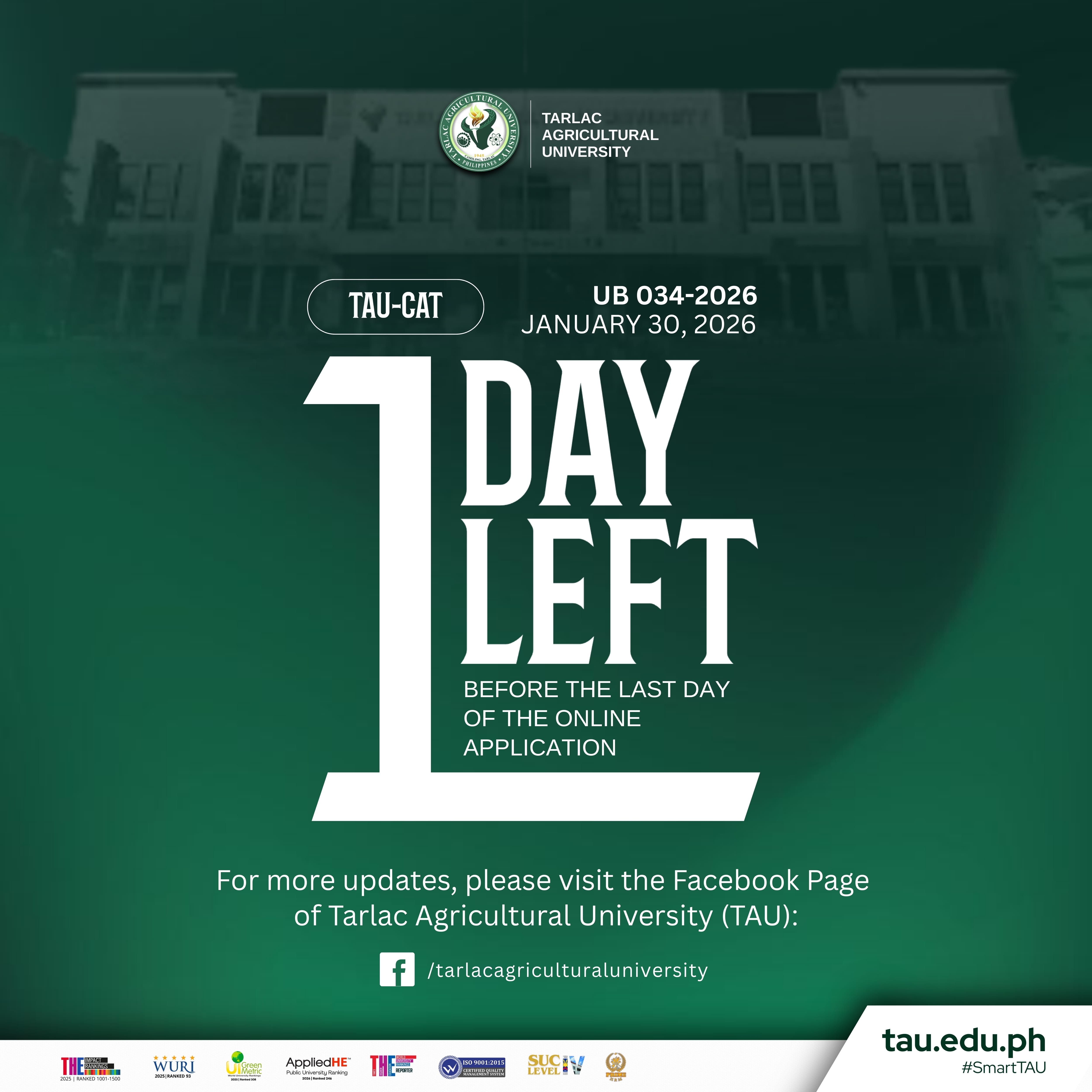 Final Call: One Day Left! Submit your application for the Tarlac Agricultural University (TAU) College Admission Test (CAT) before tomorrow's deadline.