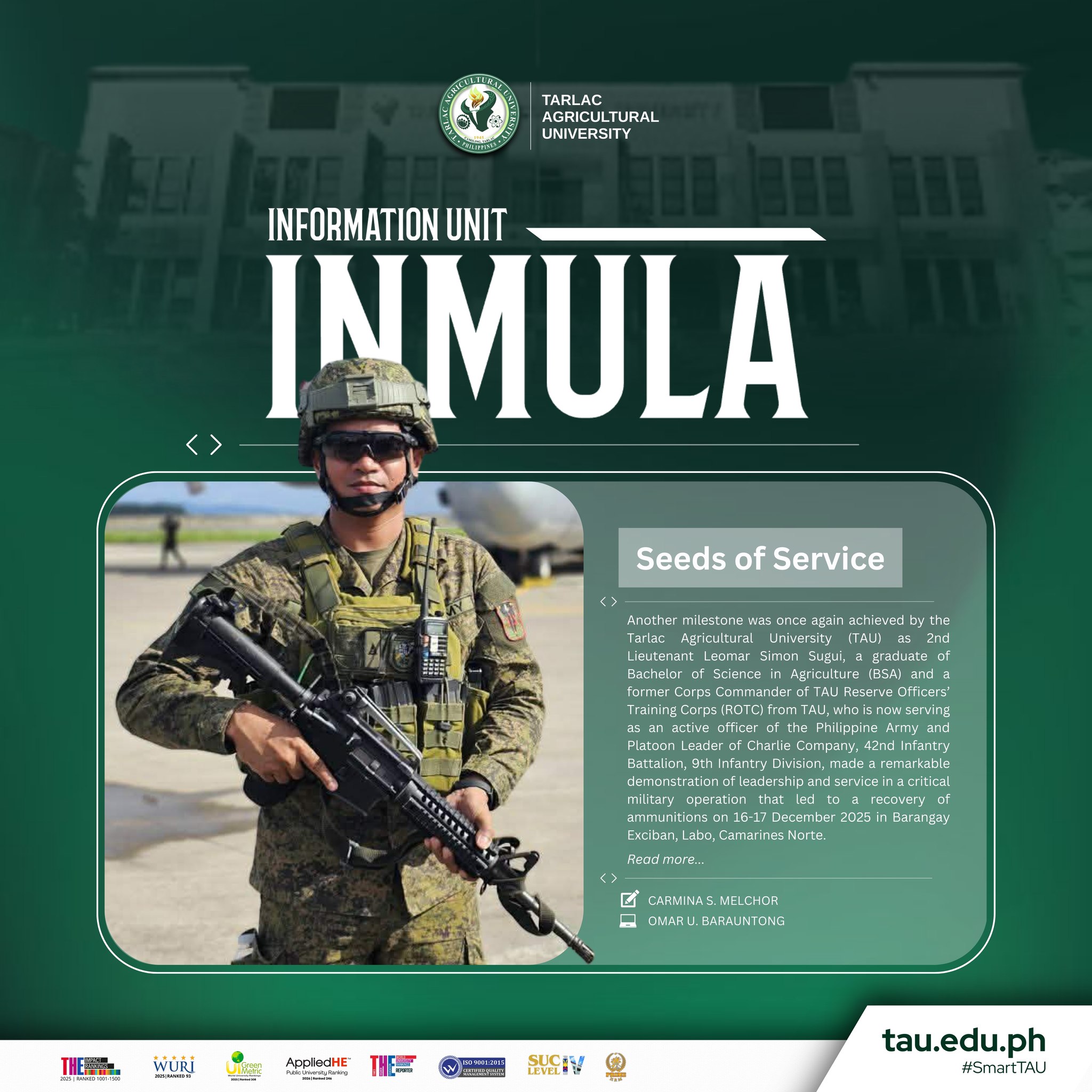 Another milestone was once again achieved by the Tarlac Agricultural University (TAU) as 2nd Lieutenant Leomar Simon Sugui, a graduate of Bachelor of Science in Agriculture (BSA) and a former Corps Commander of TAU Reserve Officersβ Training Corps (ROTC) from TAU, who is now serving as an active officer of the Philippine Army and Platoon Leader of Charlie Company, 42nd Infantry Battalion, 9th Infantry Division, made a remarkable demonstration of leadership and service in a critical military operation that led to a recovery of ammunitions on 16-17 December 2025 in Barangay Exciban, Labo, Camarines Norte.