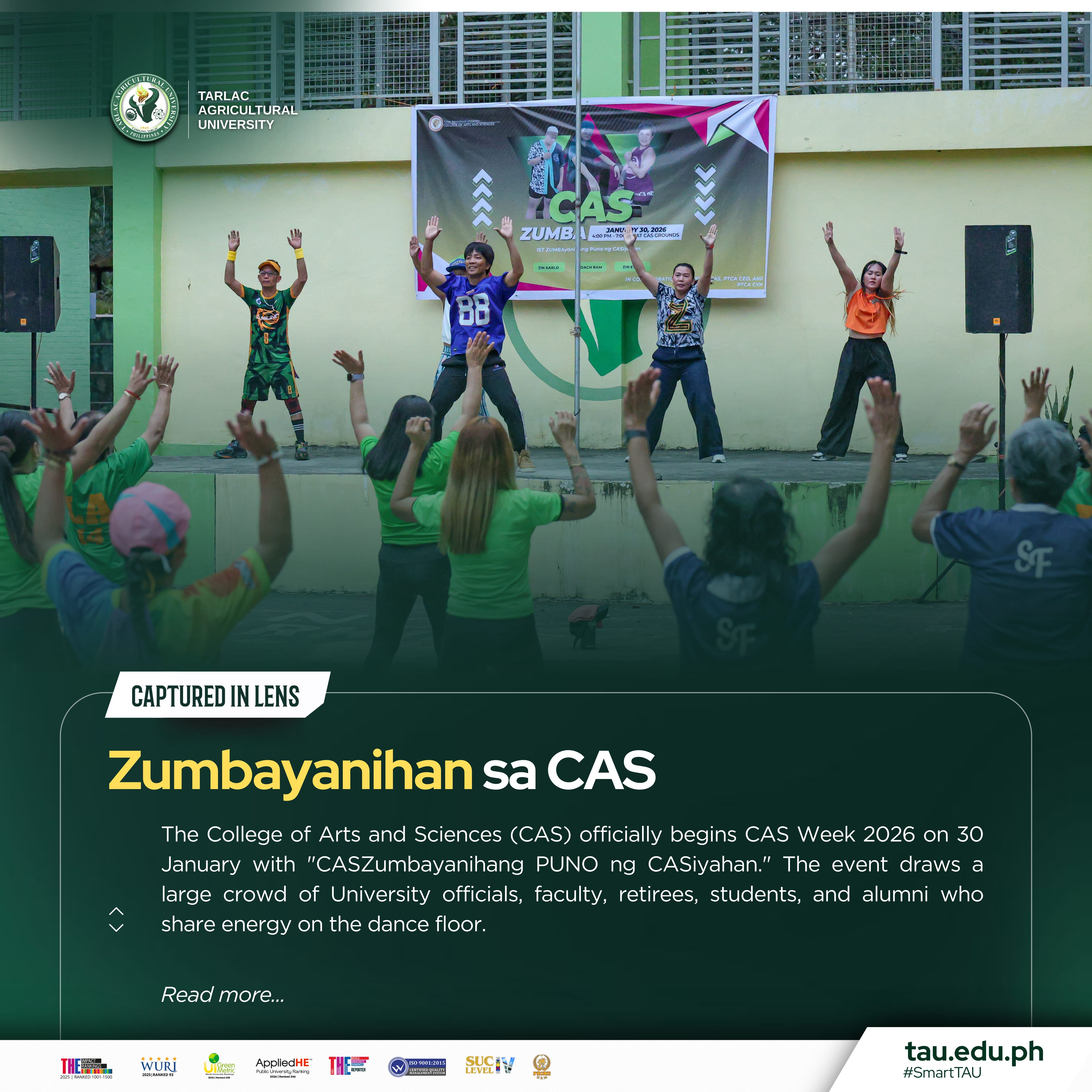 The College of Arts and Sciences (CAS) officially begins CAS Week 2026 on 30 January with "CASZumbayanihang PUNO ng CASiyahan." The event draws a large crowd of University officials, faculty, retirees, students, and alumni who share energy on the dance floor.