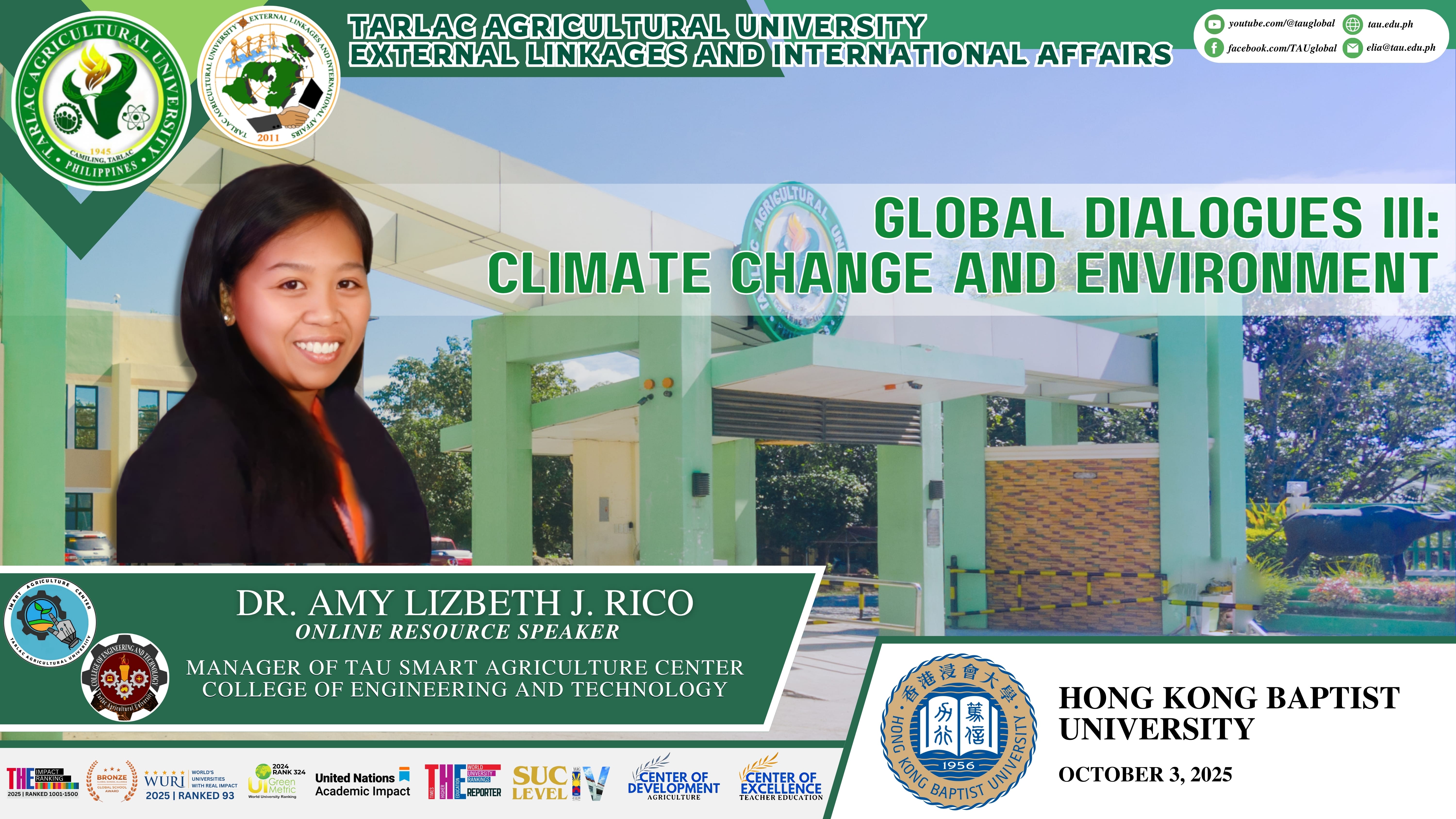 Dr. Amy Lizbeth J. Rico, Manager of the Tarlac Agricultural University - Smart Agriculture Center and a faculty member of the College of Engineering and Technology (CET), delivered a lecture to international participants during the Global Dialogues III: Climate Change and Environment, an event organized through the Enhancing English through Global Citizenship program of Hong Kong Baptist University (HKBU) on 3 October 2025, via Zoom.