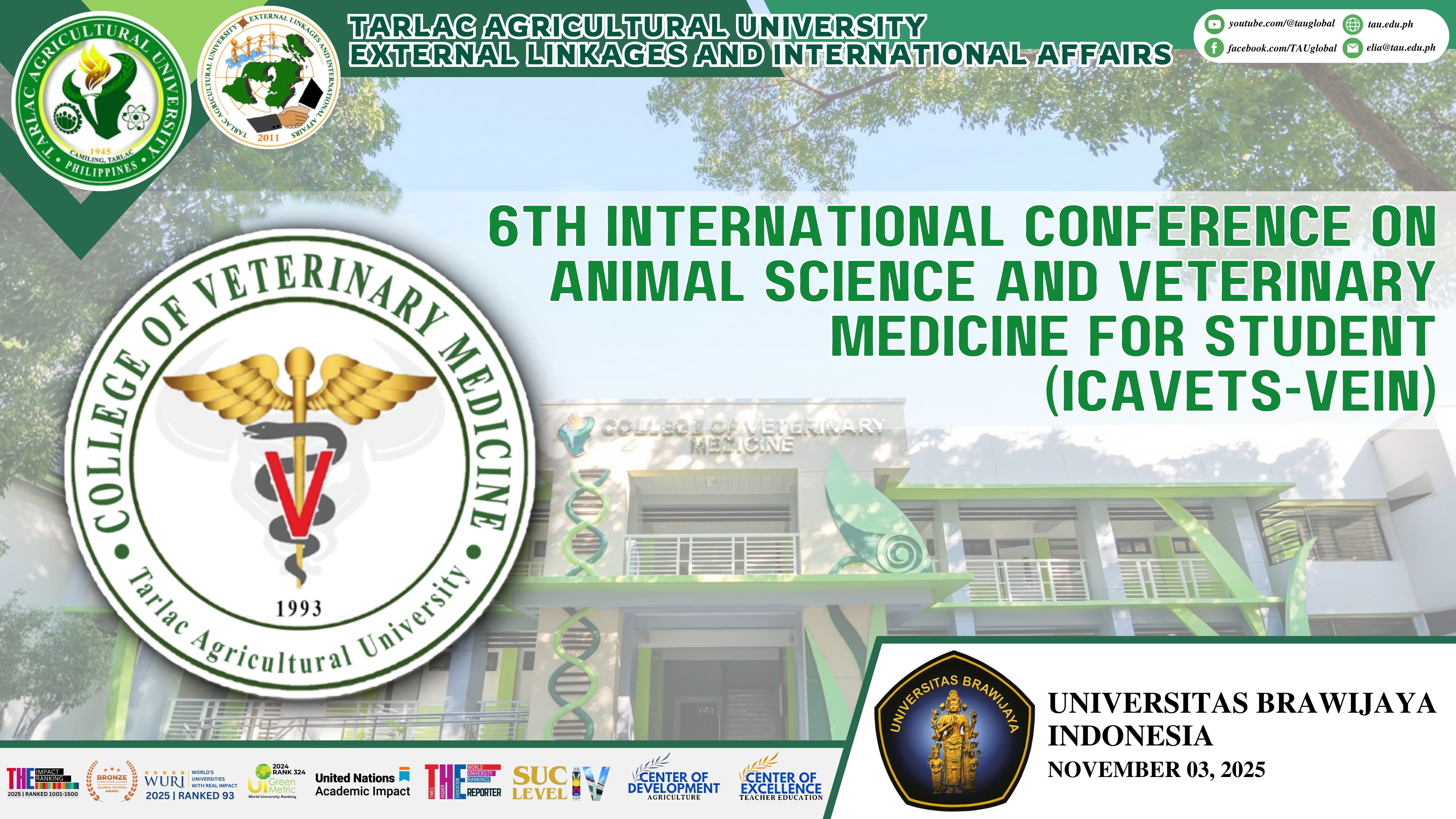Fifty (50) students from the College of Veterinary Medicine (CVM) of Tarlac Agricultural University (TAU) participated in Universitas Brawijayaโs (UB) 6th International Conference on Animal Science and Veterinary Medicine for Students (ICAVETS-VEIN) centered on the theme โTechnology and Innovation for Sustainable Livestock Production to Support Global Security,โ held on 3 November 2025 via Zoom.