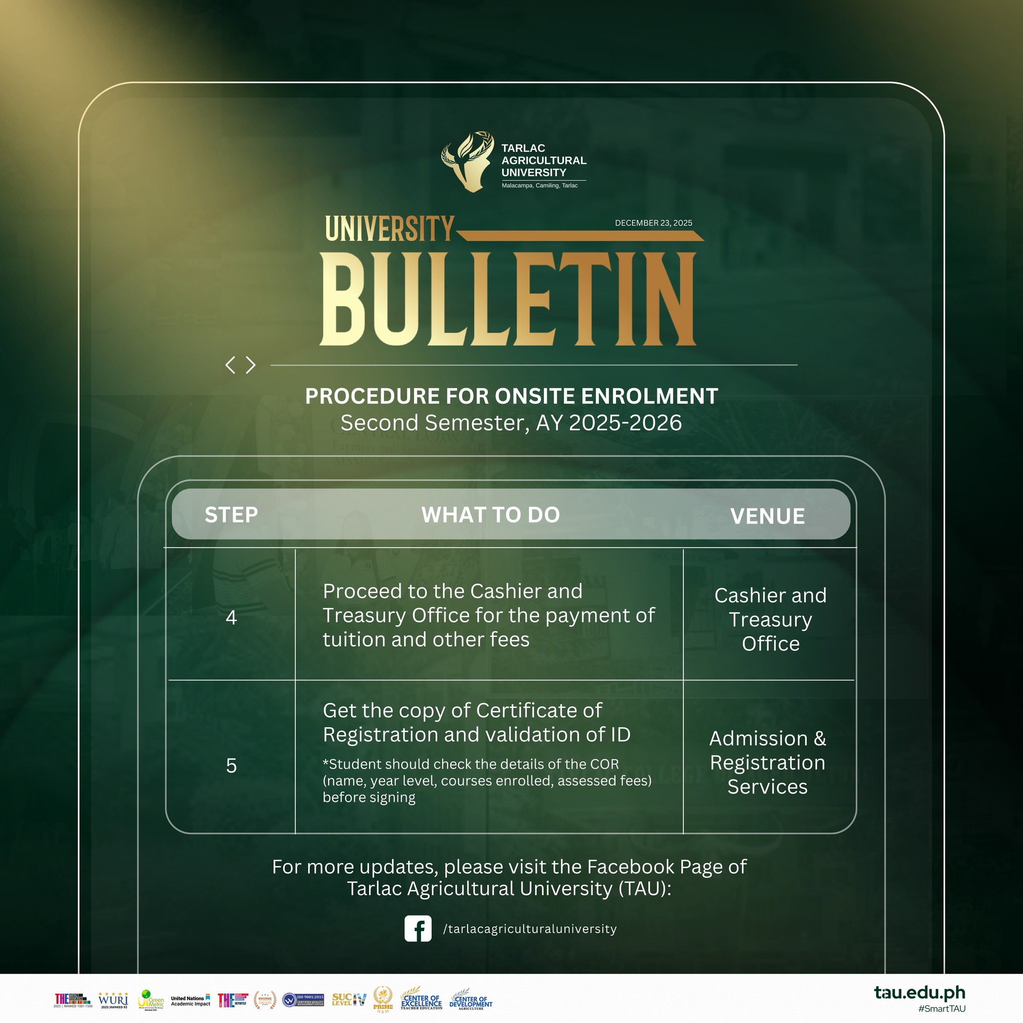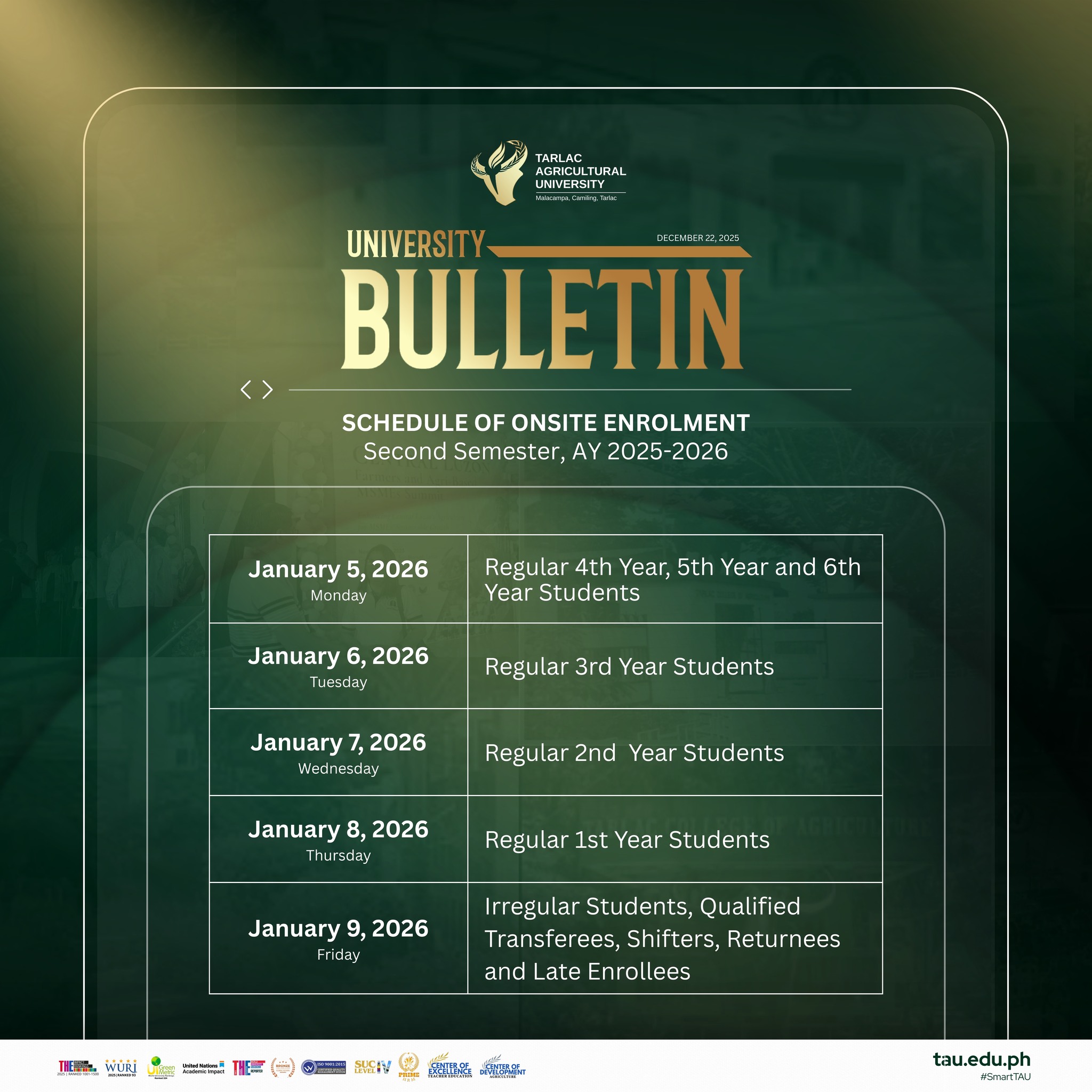 On-site enrollment officially begins on 5 January 2026. Make sure to check the posters for complete details, and prepare your requirements early to ensure a smooth, hassle-free experience. We look forward to welcoming everyone back to campus as classes start on 12 January for College Level and 17 January for Graduate Programs! Let this new term be another opportunity to learn, connect, and grow as one TAU community.