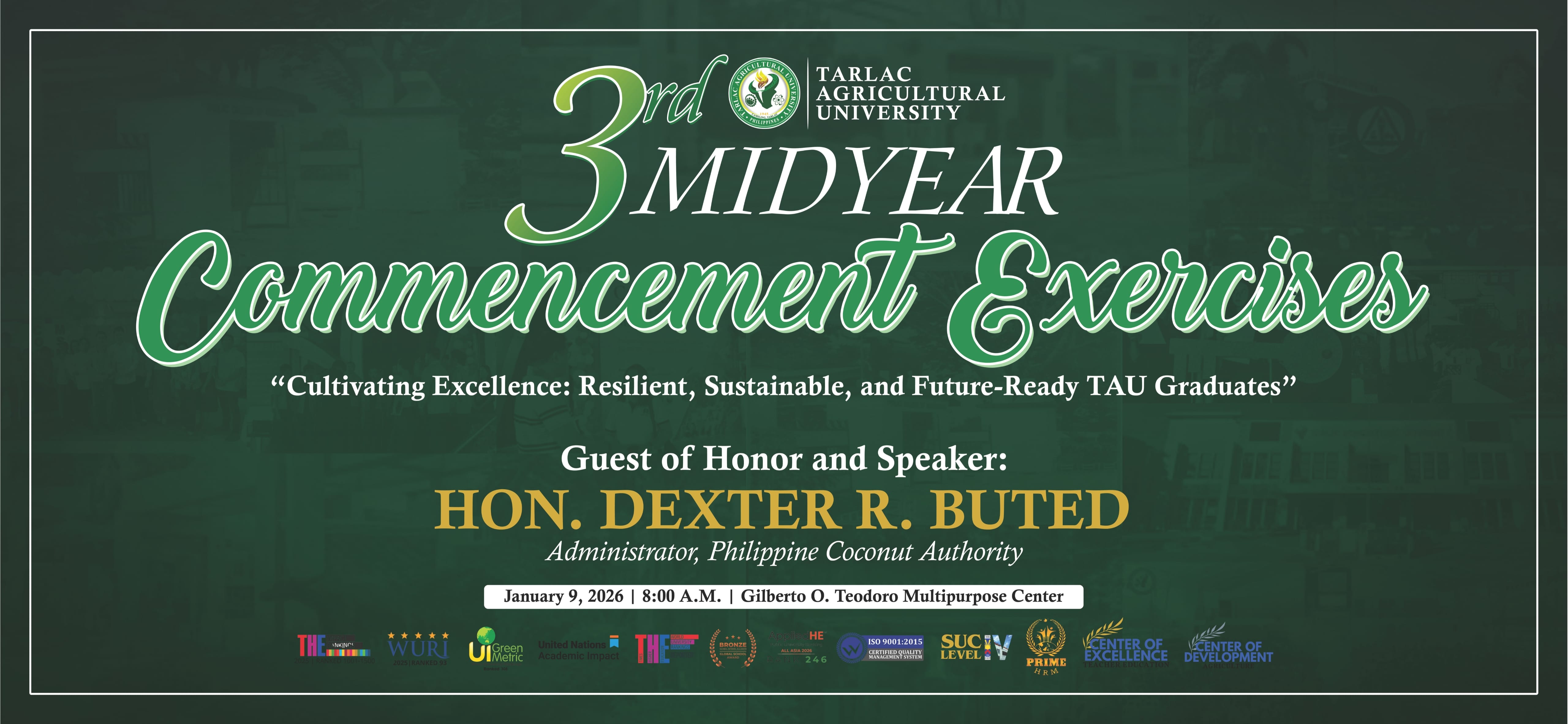 Join us at the Gilberto O. Teodoro Multipurpose Center on 9 January 2026 as we honor the culmination of determination, sacrifices, and growth of TAUians at the ๐๐ซ๐ ๐๐ข๐๐ฒ๐๐๐ซ ๐๐จ๐ฆ๐ฆ๐๐ง๐๐๐ฆ๐๐ง๐ญ ๐๐ฑ๐๐ซ๐๐ข๐ฌ๐๐ฌ. For those who cannot join in person, we invite you to be part of this special event virtually, via our official Facebook Live broadcast.ย