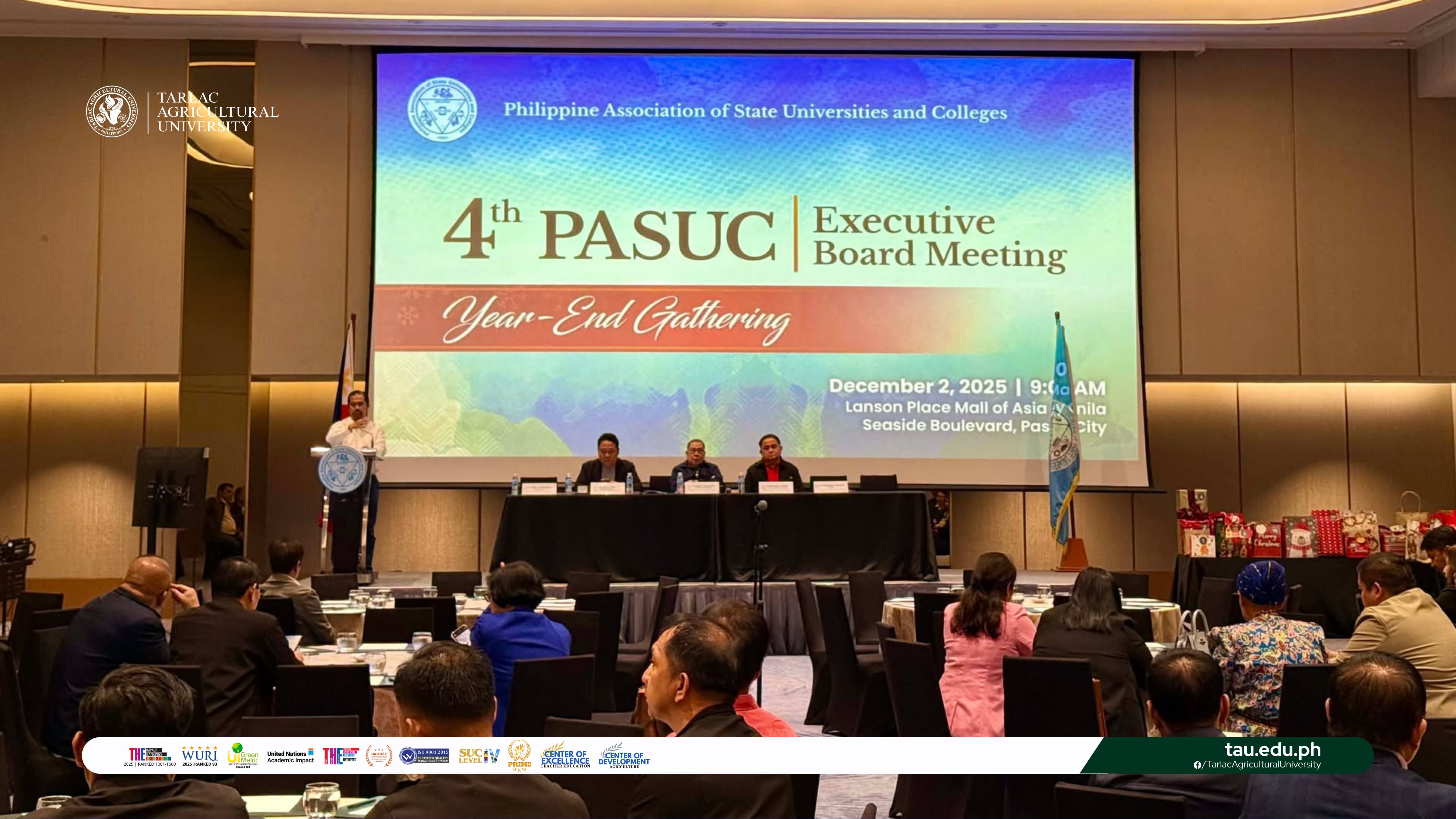 Tarlac Agricultural University (TAU) President Dr. Silverio Ramon DC. Salunson attends the 4th Executive Board Meeting cum Year-End Gathering organized by the Philippine Association of State Universities and Colleges (PASUC) on 2 December in Pasay City. Joined by fellow SUC presidents, Dr. Salunson participates in discussions on preparations for the 2026 National Culture and the Arts Festival (NCAF), updates on the revised SUC Leveling Instrument and CHED policies, and other institutional matters, underscoring TAUโs commitment to active engagement and collaboration within the state university system