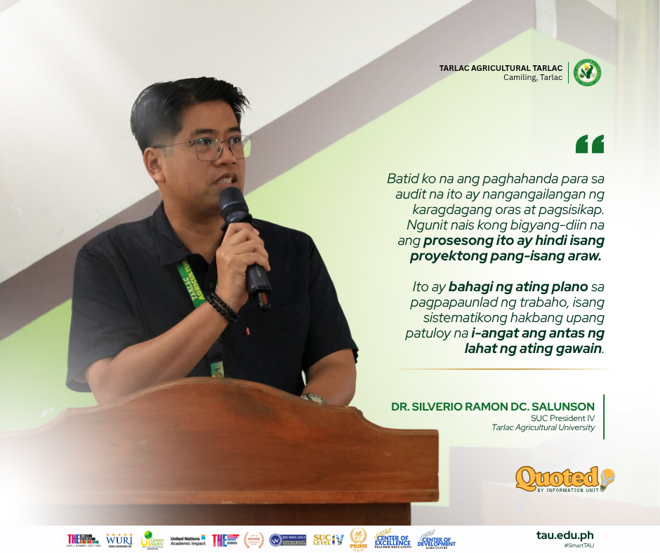 Tarlac Agricultural University (TAU) President Dr. Silverio Ramon DC. Salunson frames the ISO 9001:2015 Quality Management System (QMS) First Surveillance Audit, 14 November, as a pivotal step in the University's continuous journey toward excellence, not merely a routine evaluation. He emphasizes that the audit's core purpose is to verify the effectiveness of the QMS across all University functions and to reaffirm their commitment to high standards.