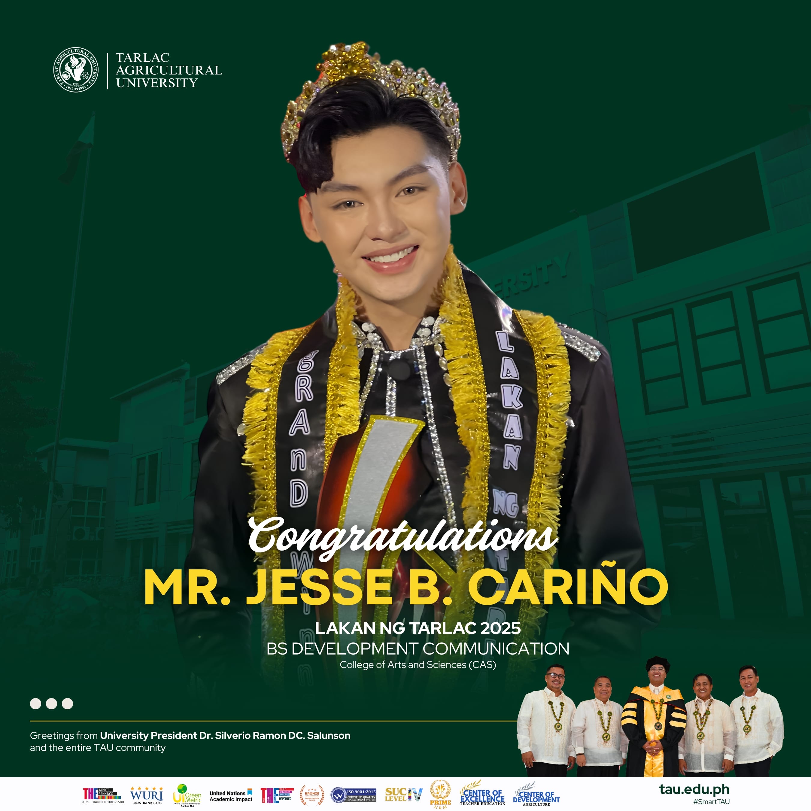 The entire Tarlac Agricultural University (TAU) extends its warmest greetings to Mr. Jesse B. CariΓ±o on his well-deserved recognition as Lakan ng Tarlac 2025. A third-year Bachelor of Science in Development Communication (BSDC) student from the College of Arts and Sciences (CAS), Mr. CariΓ±o consistently demonstrates exceptional character and serves as an outstanding representative of the Municipality of Paniqui.