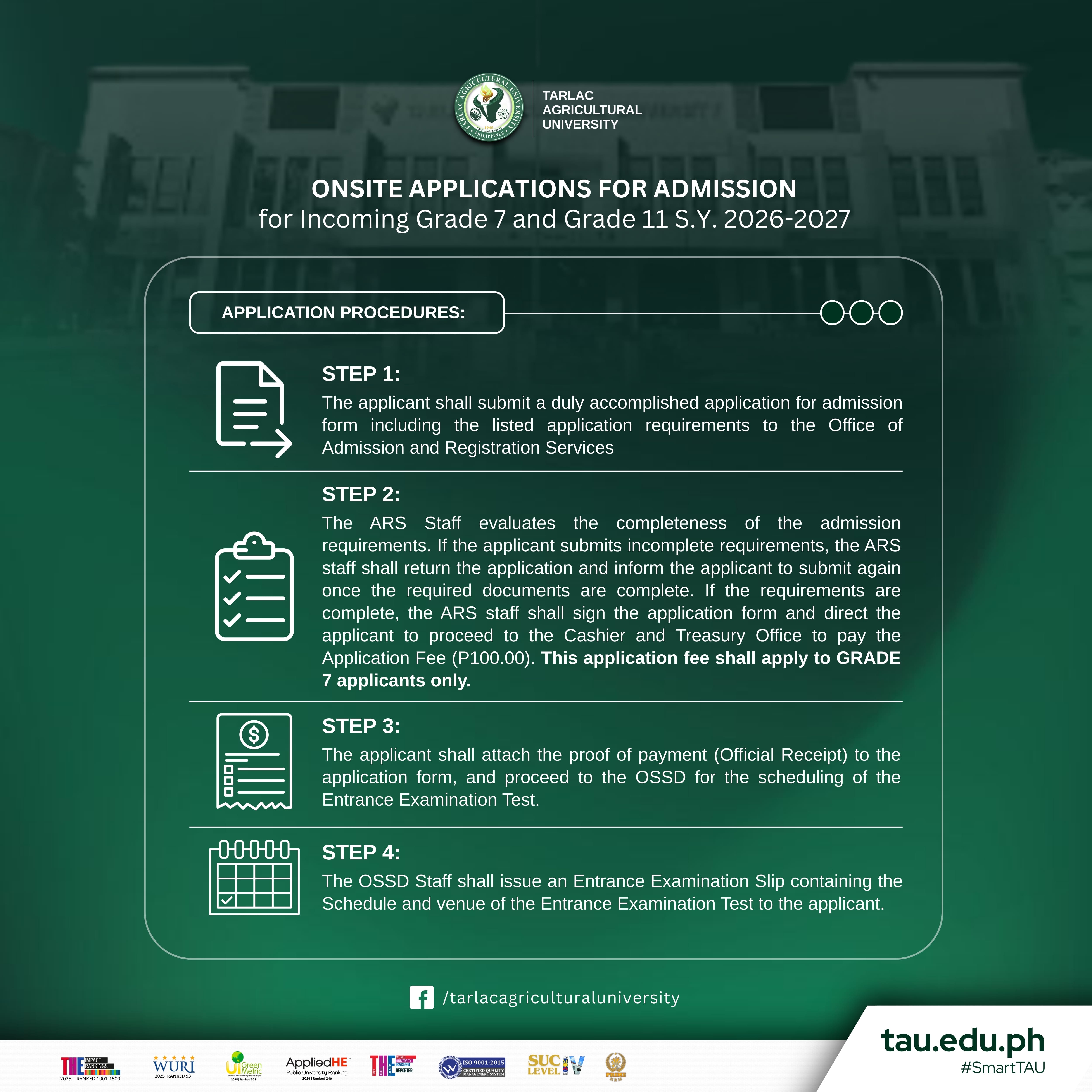 The Tarlac Agricultural University β Laboratory School (TAU-LS) is now accepting onsite applications for admission to incoming Grade 7 and Grade 11 for the School Year 2026-2027. Applicants must submit a duly accomplished form along with required documents, including a photocopy of report card (with a GWA of at least 90 for Grade 7 and 95 for Grade 11), a Certificate of Good Moral Character, a PSA Birth Certificate, a 2x2 colored ID picture with name tag, and proof of payment for the application fee. The application form can be downloaded here: https://bit.ly/4kpzaiI.