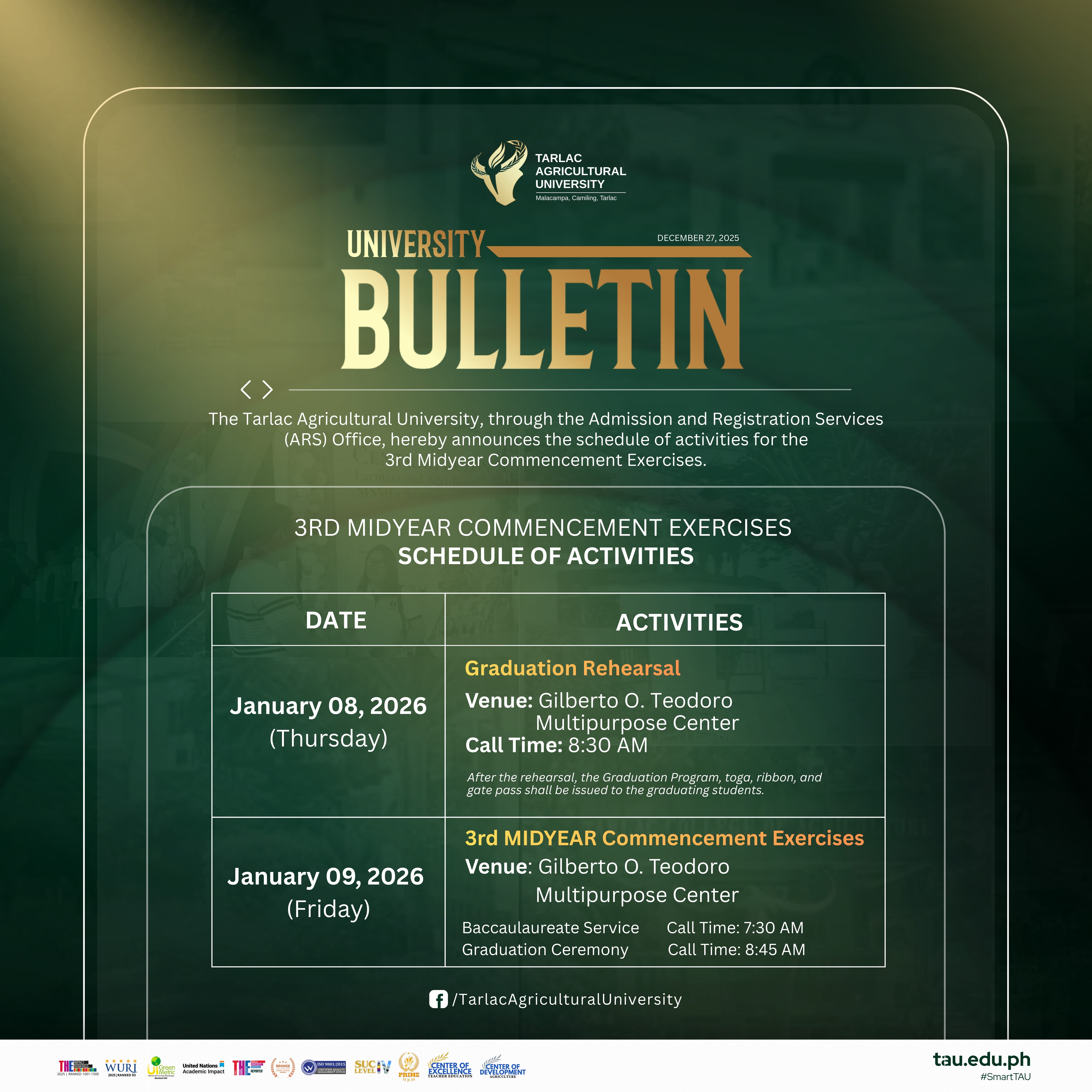 The Tarlac Agricultural University, through the Admission and Registration Services (ARS) Office, hereby announces the schedule of activities for the 3rd Midyear Commencement Exercises for graduating students of the Midyear Term and First Semester, AY 2025β2026. The Graduation Rehearsal will be held on January 08, 2026 (Thursday) at the Gilberto O. Teodoro Multipurpose Center, with a call time of 8:30 AM. Immediately after the rehearsal, the Graduation Program, Toga, Ribbon, and Gate Pass will be issued to the graduating students.