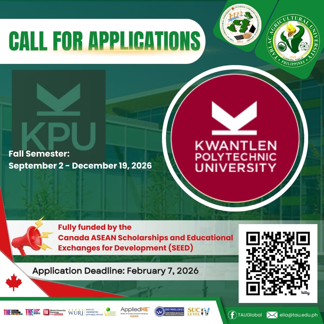 The Kwantlen Polytechnic University (KPU) of British Columbia, Canada is now accepting nominations for four (4) slots of exchange students from Tarlac Agricultural University (TAU) for the Canada ASEAN Scholarships and Educational Exchanges for Development (SEED) Program for the Fall 2026 semester which runs from 2 September to 19 December 2026.
