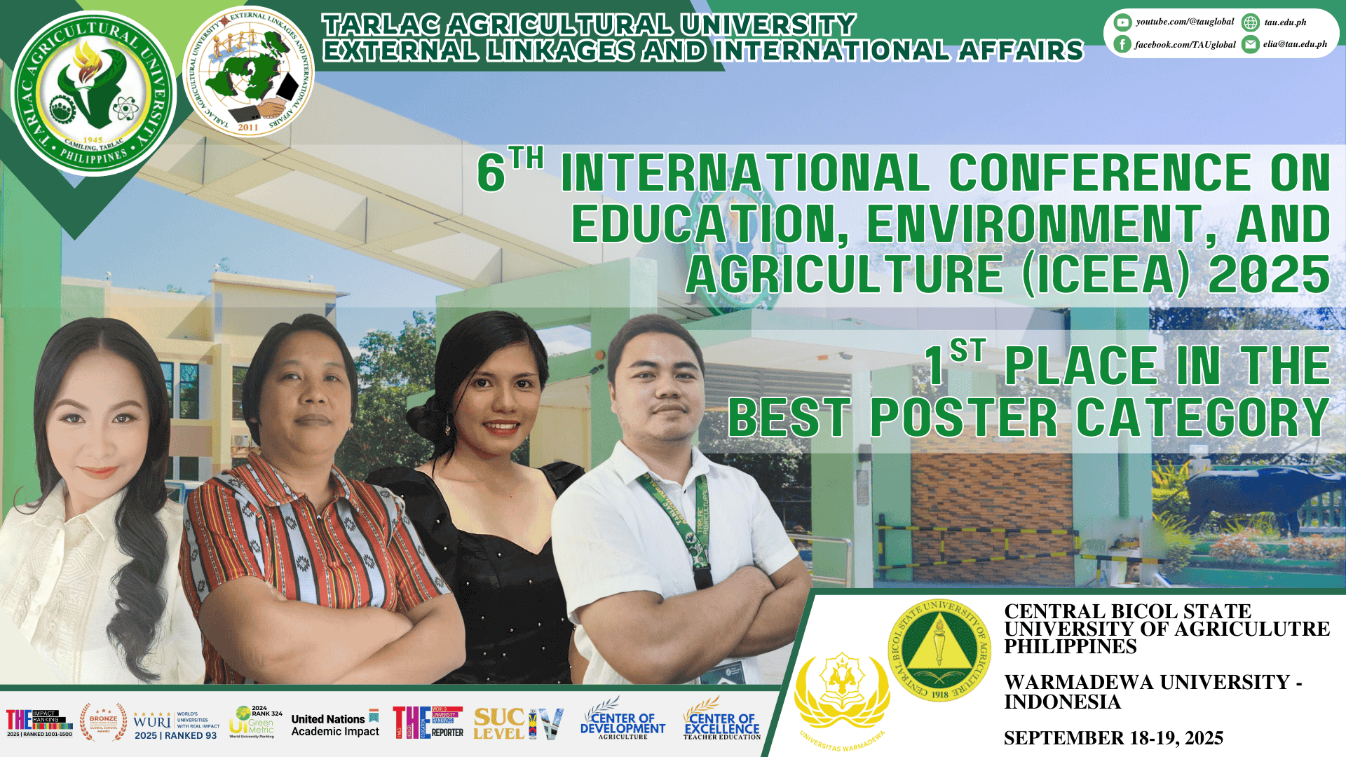 Faculty members from the College of Agriculture and Forestry of Tarlac Agricultural University (TAU) bagged First Place Best Poster Category at the 6th International Conference on Education, Environment, and Agriculture (ICEEA), held at Universitas Warmadewa (UNWAR) in Bali, Indonesia, on September 18-19, 2025.